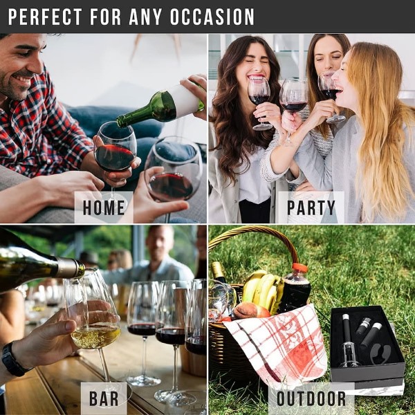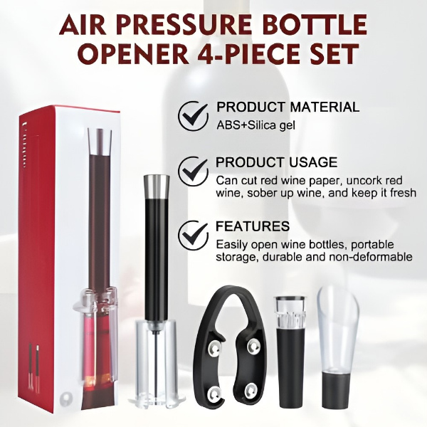 Táto 4-v-1 sada obsahuje otvárač s pumpou na vzduch, orezávač fólie, prevzdušňovač a vákuovú zátku pre dokonalý zážitok z vína.